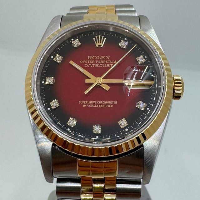 Detalles del productoReloj Rolex Datejust 16233 con esfera degradada en rojo y detalles de diamantes. Un clásico de la relojería.