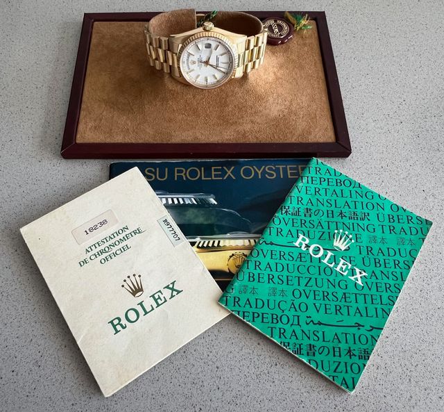 Detalles del productoReloj Rolex Oyster Perpetual Day-Date, referencia 18238, fabricado en oro. Incluye certificado de cronómetro oficial.