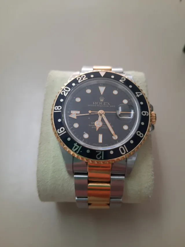 Detalles del productoReloj Rolex GMT Master 2, modelo 16713. Una pieza icónica que combina acero y oro.