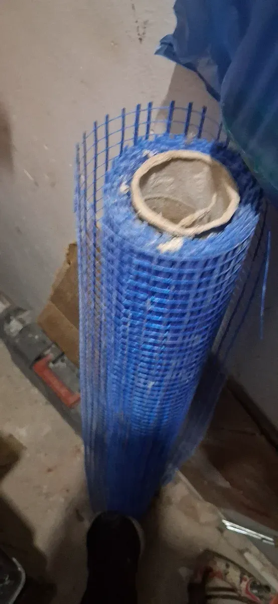 Detalles del productoRollo de malla de fibra de vidrio de color azul, ideal para refuerzos en construcción o reparaciones.