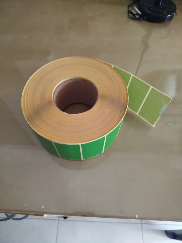 Detalles del productoRollo de pegatinas de color verde brillante, con líneas blancas que marcan cada etiqueta.
