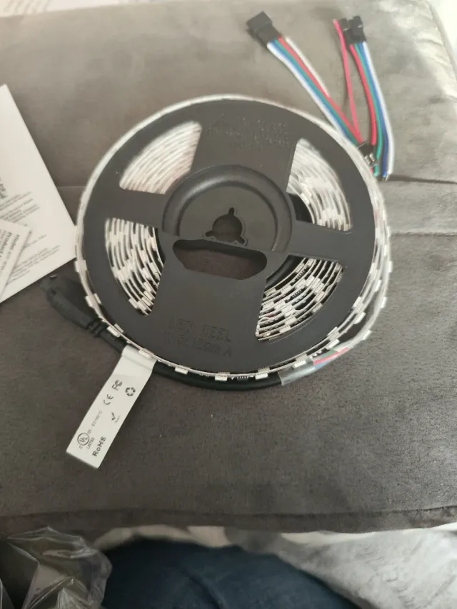 Rollo de luces LED RGB para decoración. - Luces LED enrolladas en carrete. - Incluye cables de conexión.