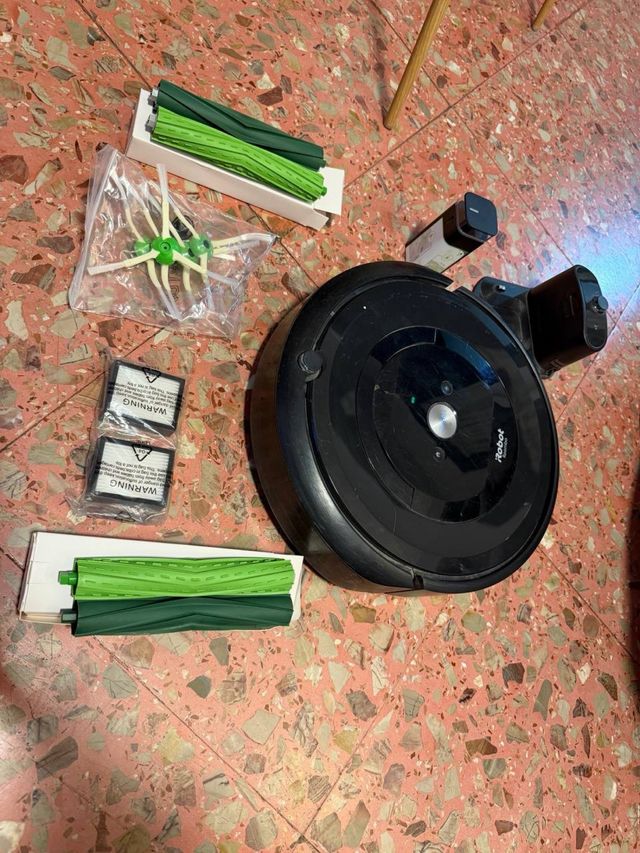 Detalles del productoRobot aspirador Roomba e5 en color negro. Incluye accesorios para su mantenimiento.