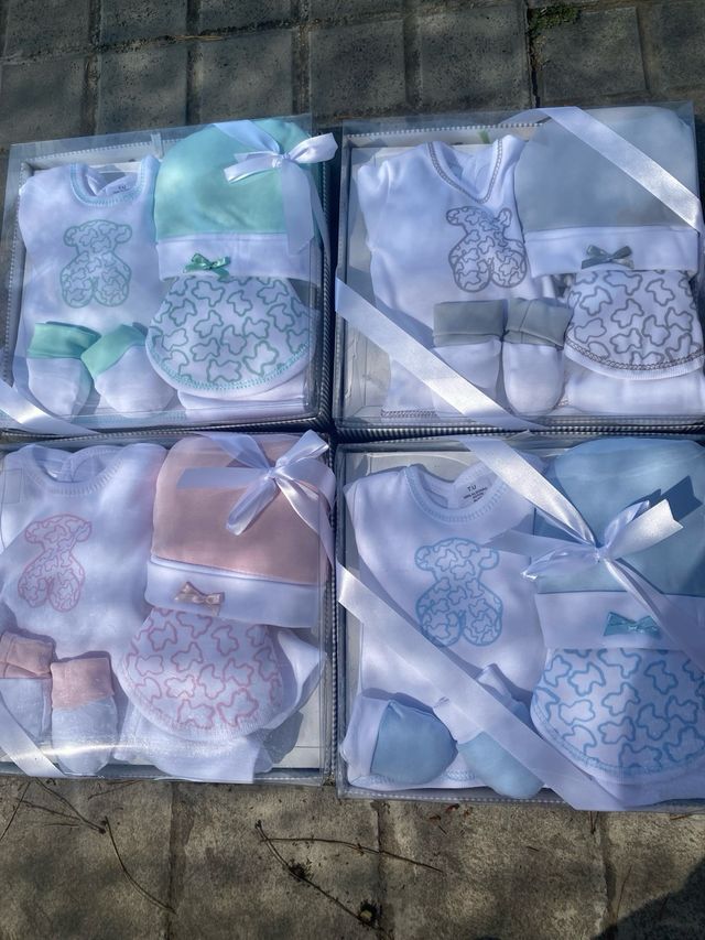 Detalles del productoPreciosos conjuntos de ropa para bebé recién nacido, ideales para regalo. Cada conjunto incluye 5 piezas: body, gorro, manoplas, calcetines y babero. Los conjuntos son de color gris azul y rosa de 5 piezas cada uno. - Ropa de algodón suave. - Diseño de ositos. - Perfectos para regalo.