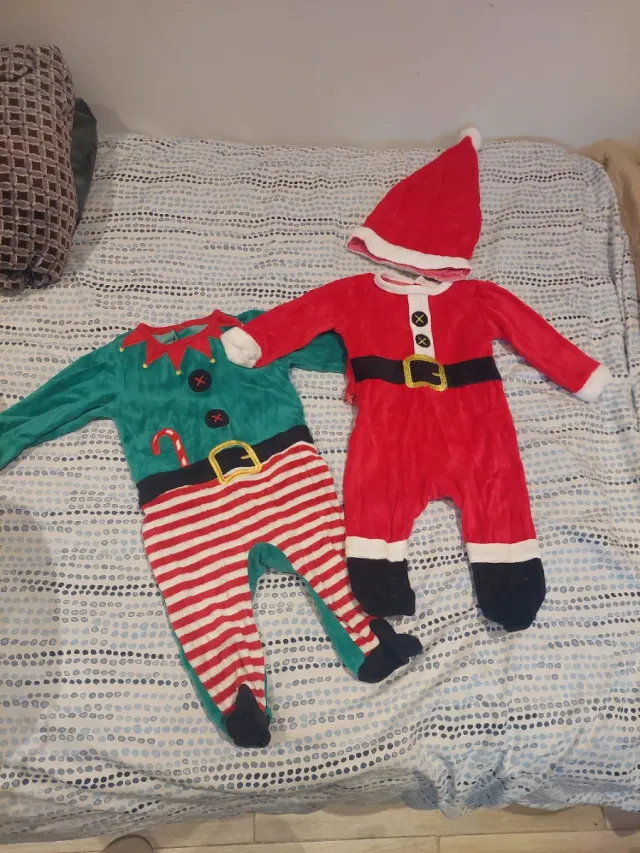 Conjunto de ropa para bebé con temática navideña. - Disfraz de elfo con rayas rojas y verdes. - Disfraz de Papá Noel rojo con gorro.
