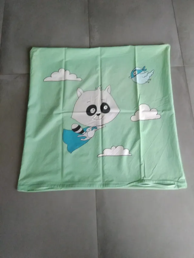 Conjunto de ropa de cama infantil con un divertido diseño. - Estampado de mapache superhéroe volando. - Incluye nubes y un pájaro. - Color verde menta.