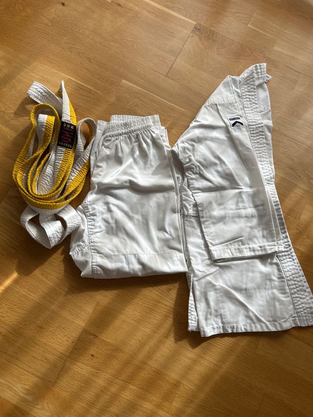 Detalles del productoConjunto de ropa de judo en color blanco, ideal para la práctica de este deporte. Talla 140cm. Outshock/decathlon. Incluye un cinturón de judo en color amarillo.