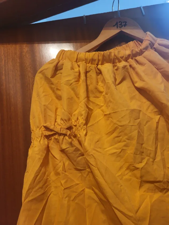 Detalles del productoPrenda de ropa de mujer en color mostaza. Tiene un diseño con elástico en la cintura y un detalle de lazo.