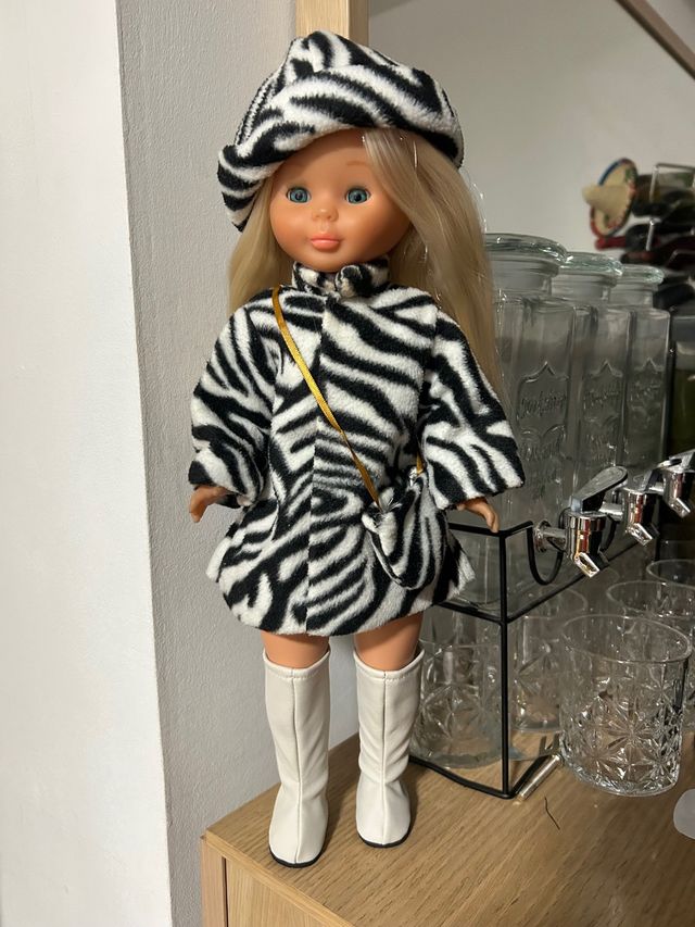 Conjunto de ropa para muñeca Nancy. - Chaqueta y gorro con estampado de cebra. - Bolso a juego. Segunda mano
