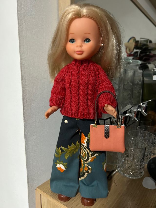 Conjunto de ropa para muñeca Nancy. - Jersey rojo de punto - Pantalón ancho estampado floral. - Incluye bolso a juego.