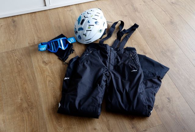 Pantalón con tirantes esquí y nieve impermeable para niñ@. Casco 59-62 cm. L. y gafas, todo sin uso, por varios inviernos consecutivos sin nieve. Todo por 50 euros