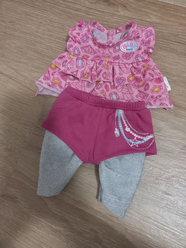 Conjunto de ropa para muñeco bebé. Original Baby Born. - Camiseta rosa con estampado de joyas. - Pantalón corto fucsia. - Polainas plateadas.
