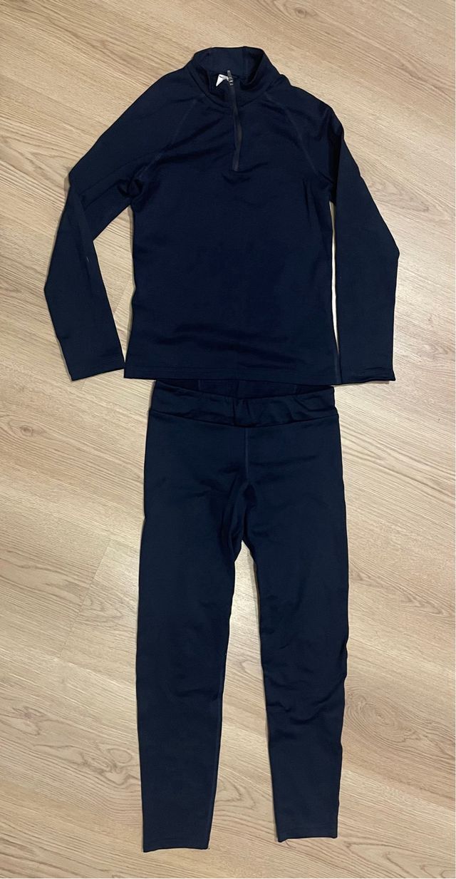 Detalles del productoConjunto de 2 camisetas térmicas con cremallera delantera, con área de transpiración espalda, marca Decathlon (blanca y marino), y mallas térmicas mismo tejido (marino). Ideales para esquiar.