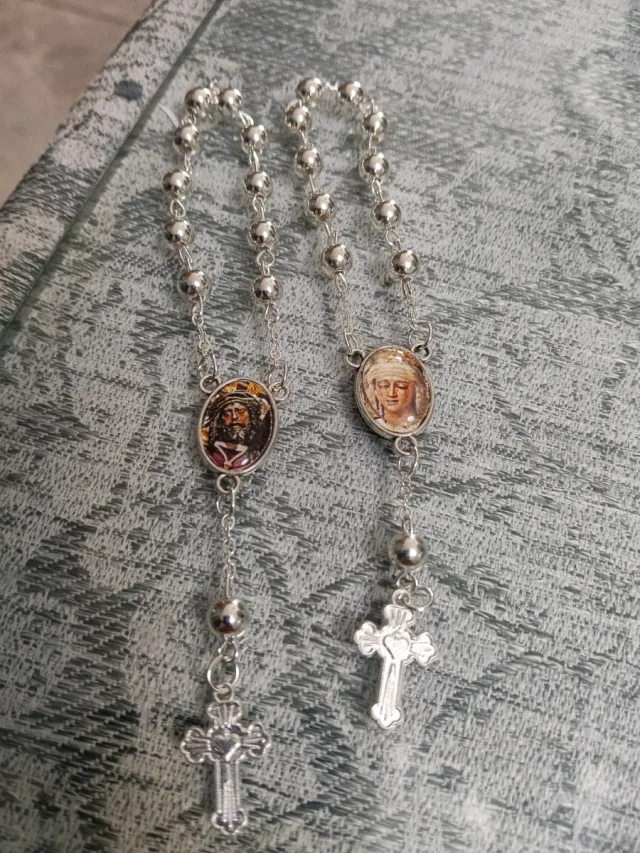 Este rosario presenta imágenes a doble cara del Gran Poder. Es un accesorio religioso con un diseño detallado.
