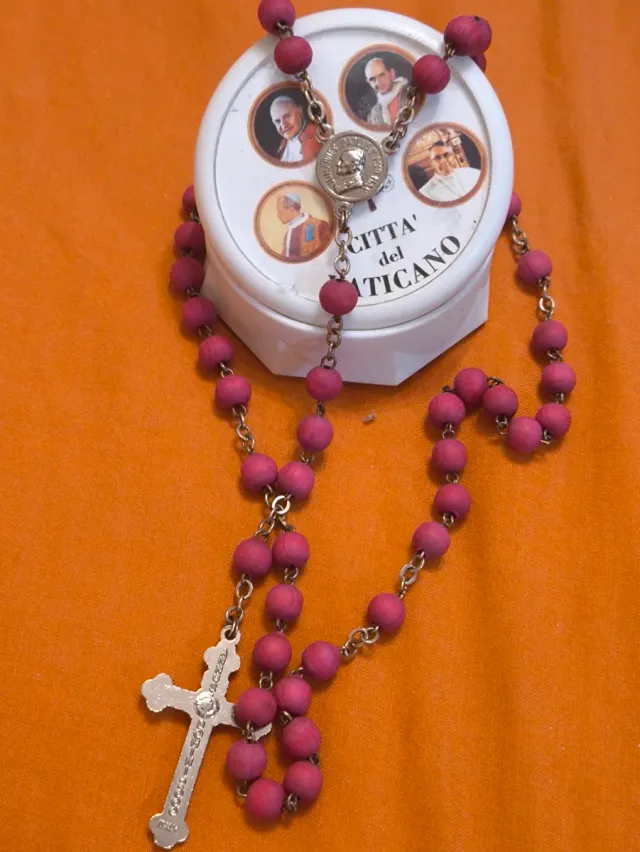 Detalles del productoRosario con cuentas de madera en color rosa.