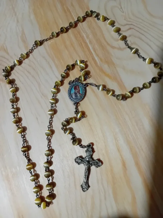 Elegante rosario con cuentas de ojo de gato. - Cuentas ovaladas de ojo de gato. - Cadena metálica. - Medalla central. - Crucifijo detallado.