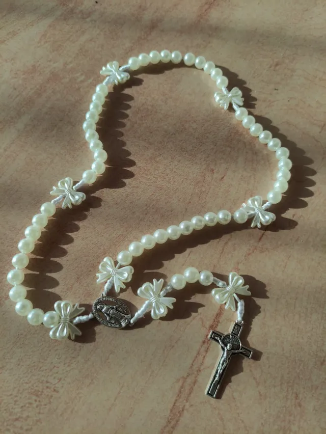 Rosario perlas blancas con cruces y medalla.