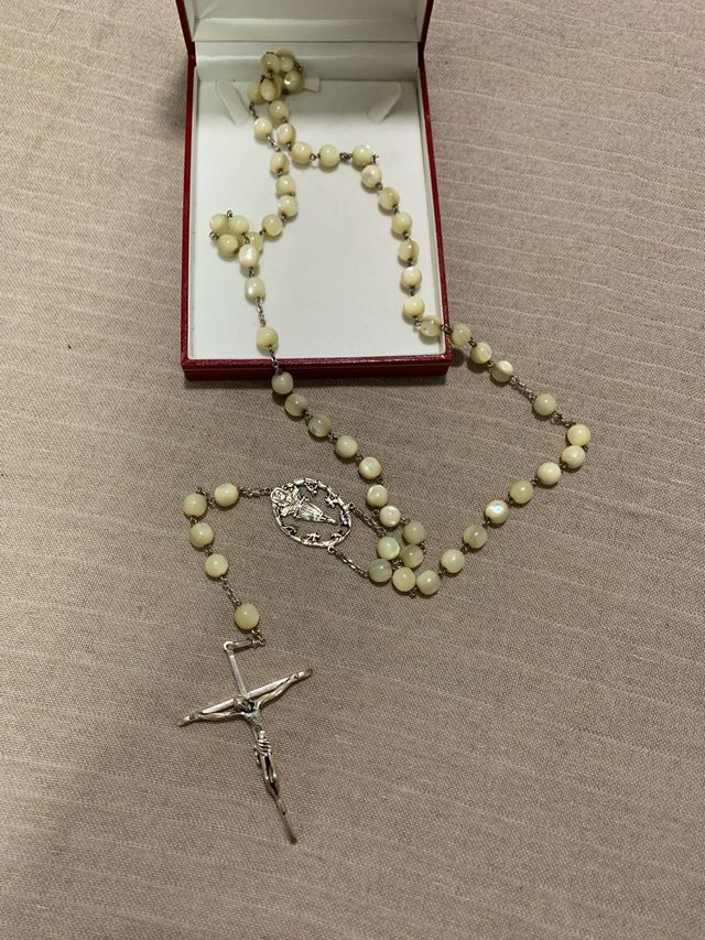 Detalles del productoElegante rosario elaborado con cuentas de nácar y detalles en plata. Incluye una medalla central y una cruz.
