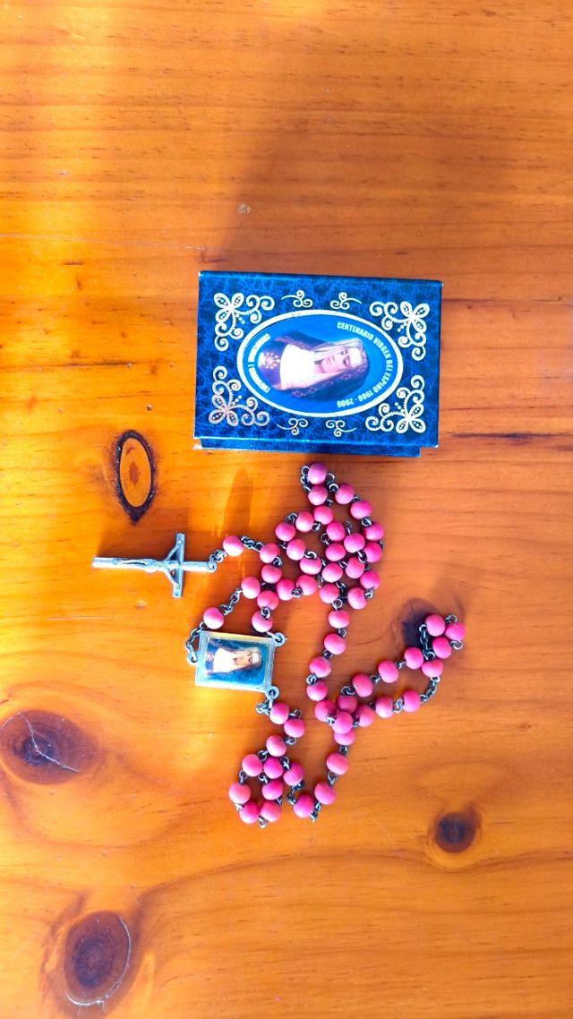 Detalles del productoRosario con cuentas rosas y medalla de la Virgen del Espino de Chauchina, Granada. Incluye caja.