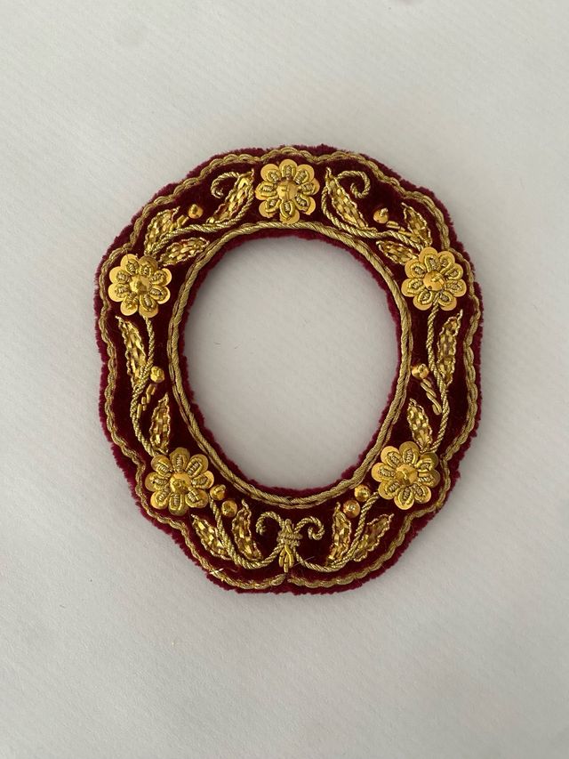 Detalles del productoPrecioso rostrillo para imagen religiosa bordado en hilo de oro sobre terciopelo de color burdeos. Presenta motivos florales y hojas, con pequeños detalles de lentejuelas y cuentas doradas.