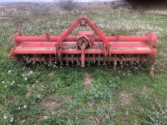 Rotobator de color rojo, ideal para preparar la tierra. - Cuchillas para labranza. - Conexión para tractor. 3 metros
