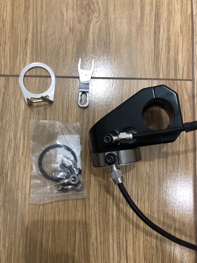 Van con otro kit de banjos, conectores, torica de repuesto y dos bloqueadores inferior, uno que va anclado a la potencia y otro va al cuadro.