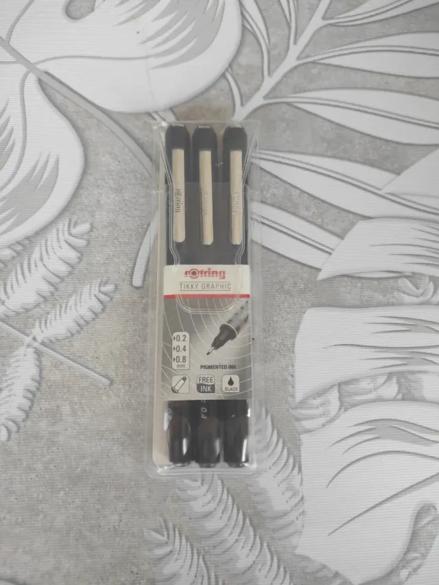 Set de tres rotuladores Rotring Tikky Graphic. - Tinta negra pigmentada. - Incluye puntas de 0.2 mm, 0.4 mm y 0.8 mm.