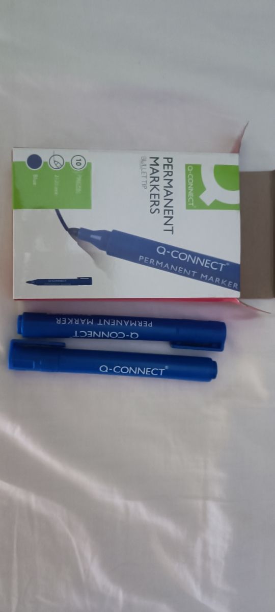 Detalles del productoDos rotuladores permanentes Q-Connect de color azul. Son nuevos y vienen en su caja original.