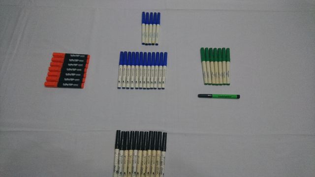 Vendo lote de rotuladores Villeda azul, negro y verde. También incluye 7 subrayadores naranja Artline. 17 azules, 11 negros y 7 verdes. Regalo subrayador verde.