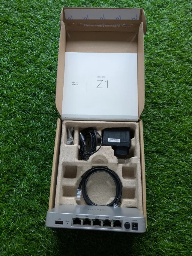 Router Cisco Meraki Z1 en su caja original. - Incluye router, adaptador de corriente y cable de red. - Documentación incluida.