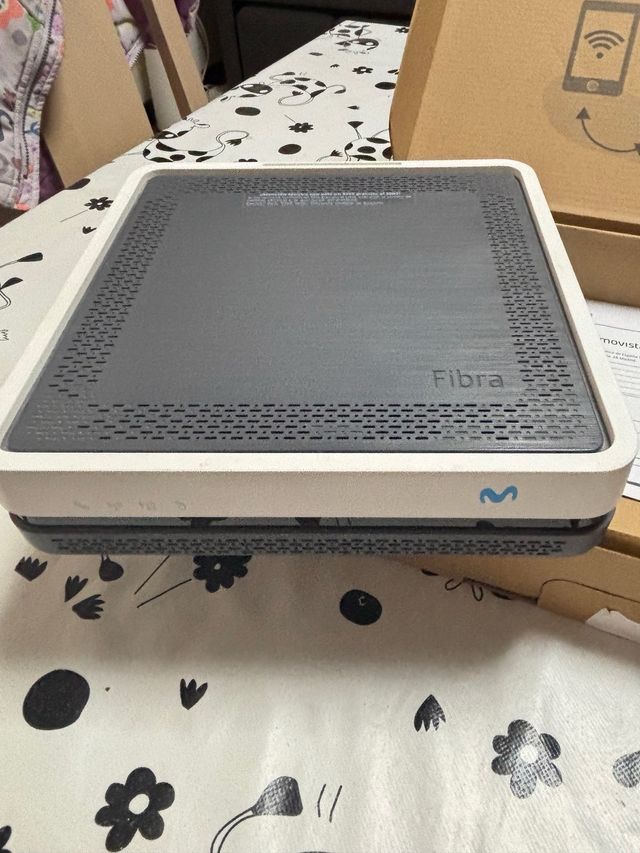 Router de fibra óptica de Movistar. Diseño moderno y compacto. - Color gris y blanco. - Indicador luminoso frontal. - Logo de Movistar visible. - Red 2,4ghz y 5ghz