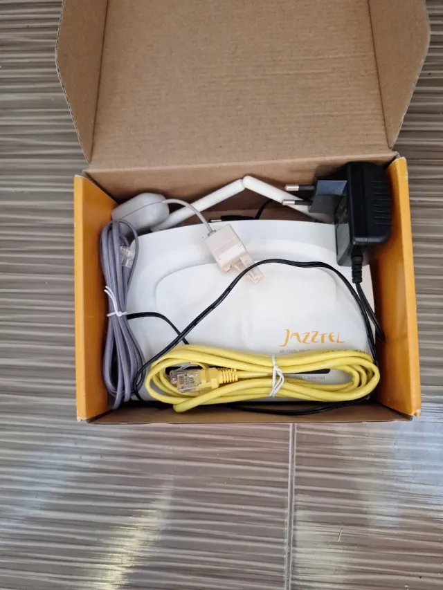 Router inalámbrico de Jazztel en color blanco. - Incluye cables y adaptador de corriente.