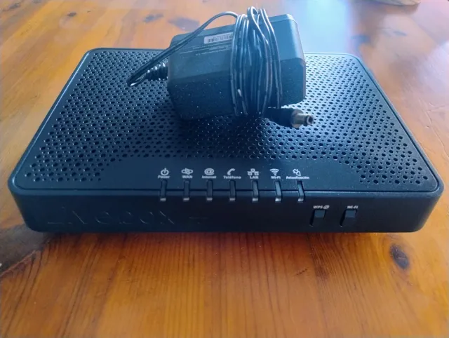 Router Livebox+ en color negro. - Diseño con rejilla superior para ventilación. - Indicadores LED frontales para estado. - Botones WPS y Wi-Fi en la parte frontal.