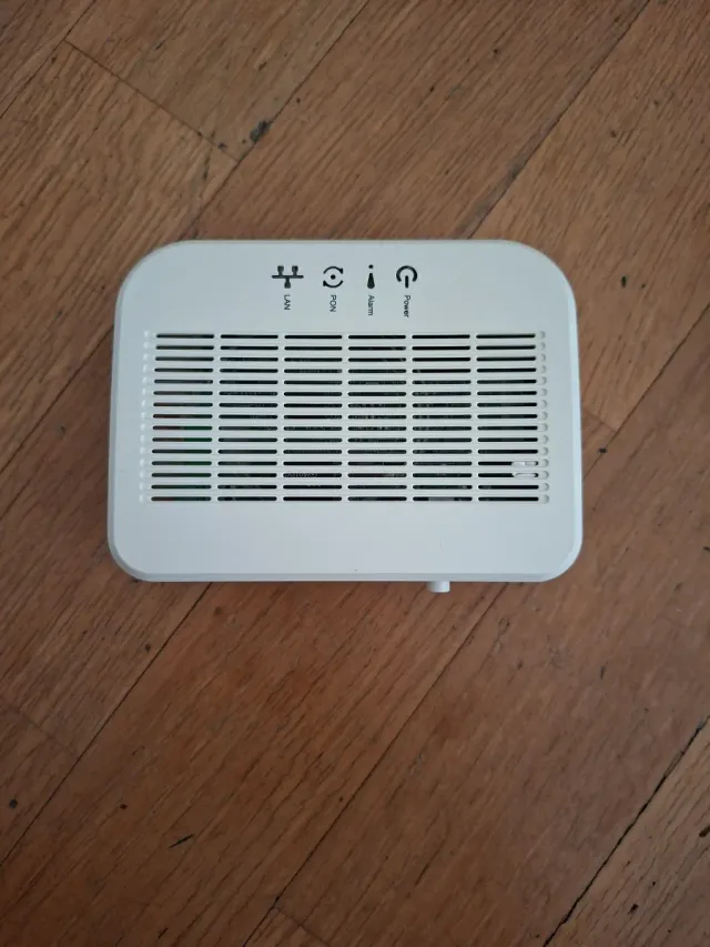 ONT Nokia G-010G-P. - Indicadores LED para LAN, PON, Alarm y Power. - Diseño blanco con rejillas de ventilación. - Cable de alimentación