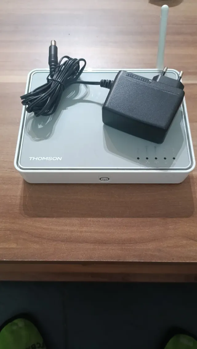 Router Thomson TG585 v7 con adaptador de corriente y cable. - Diseño compacto y moderno. - Antena integrada para conectividad inalámbrica.