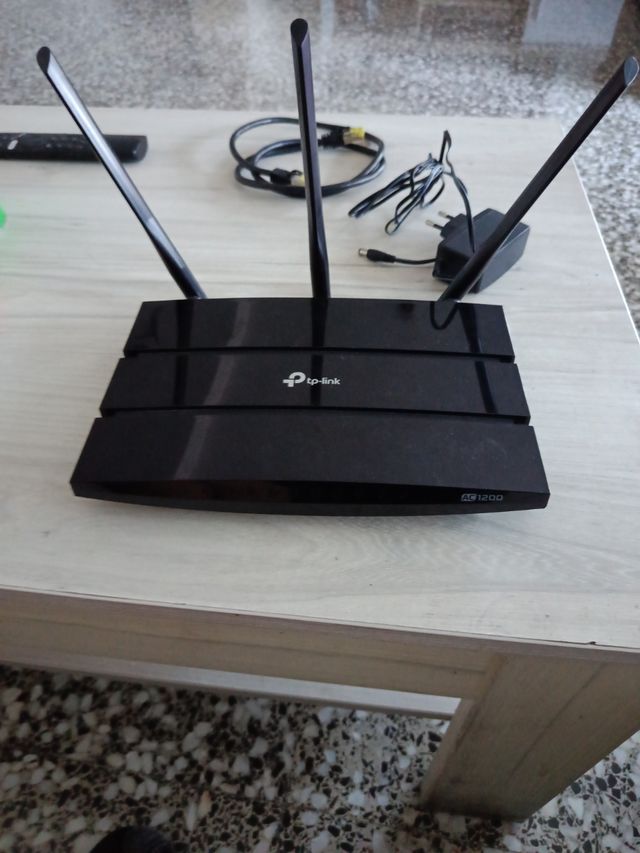 Router TP-Link con tres antenas para una mejor cobertura Wi-Fi. - Modelo AC1200. - Diseño en color negro. - Incluye adaptador de corriente y cable de red.