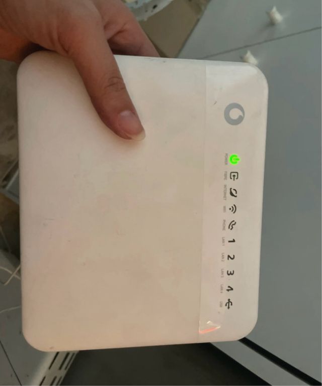 Router Vodafone en color blanco. - Indicadores LED para Power, Fibra, Internet, WiFi, Phone. - Puertos LAN 1, 2, 3, 4. - Puerto USB.