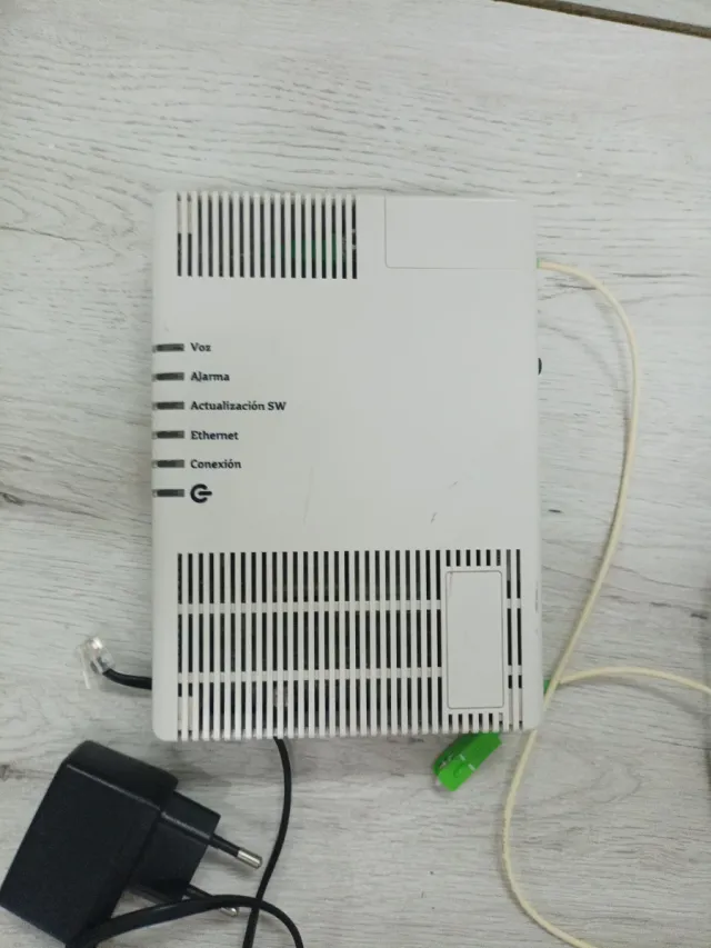 Detalles del productoRouter con indicadores de voz, alarma, actualización de software, Ethernet y conexión. Incluye adaptador de corriente.