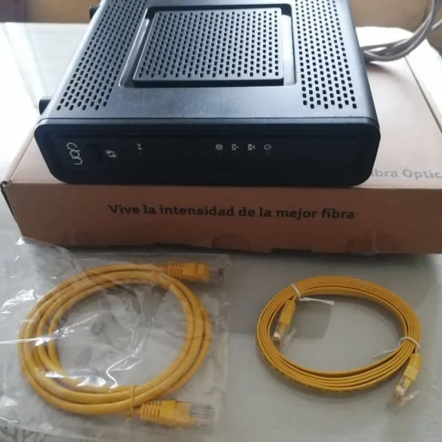 Detalles del productoRouter WiFi de la marca CBN, diseñado para conexión de fibra óptica. Incluye cables de red.