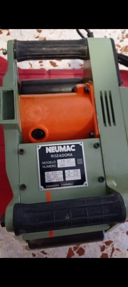 Rozadora Neumac modelo FR-07. - Voltaje: 220 V - Frecuencia: 50 Hz - Potencia: 700 W - Amperaje: 3.5 A - Velocidad: 1300 min⁻¹ - Fabricada en Zaragoza (España)