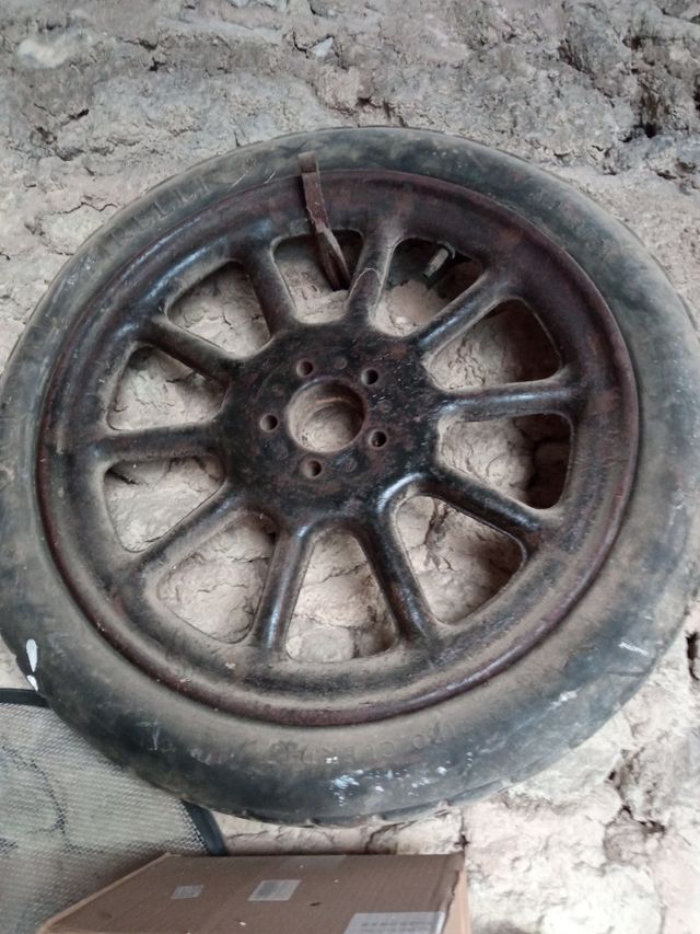 Detalles del productoAntigua rueda de coche Fiat 501. Se encuentra en buen estado de conservación, aunque muestra señales de desgaste por el paso del tiempo.