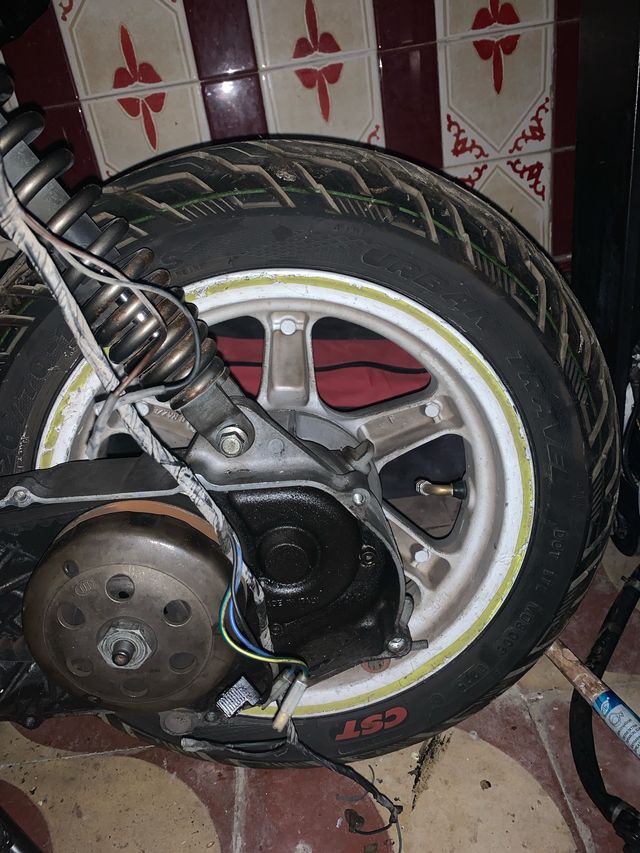 Rueda de moto CST con llanta plateada y detalles amarillos. - Llanta de aleación. - Neumático con dibujo urbano. - Válvula de aire visible.