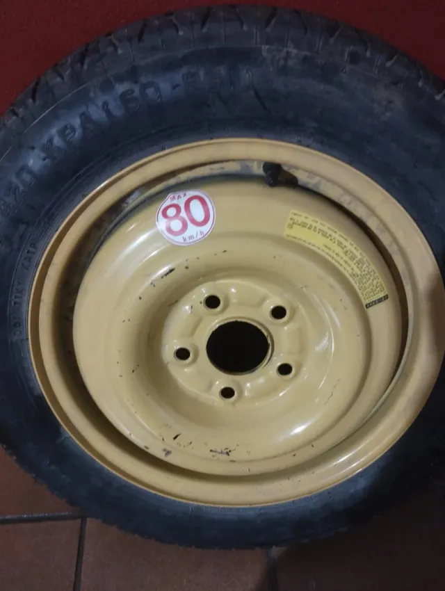 Rueda de repuesto para coche con llanta de 5 tornillos. Medidas en las fotos - Llanta de color amarillo. - Incluye pegatina de velocidad máxima 80 km/h.