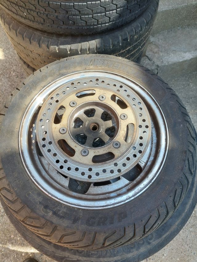 Rueda delantera de Suzuki Burgman 400 k2 del 2002. Neumatico prácticamente nuevo. Llanta de aluminio. Neumatico Michelin 110/90-13