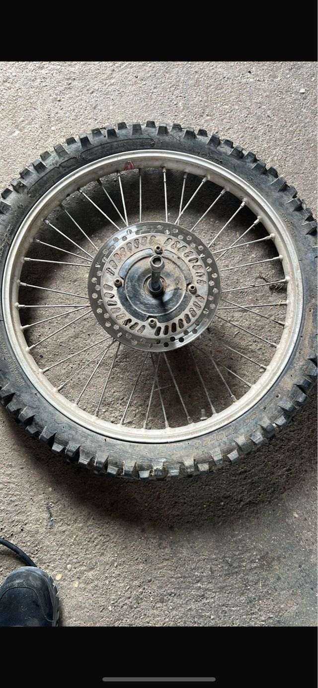 Rueda delantera para Honda CRM 50. Incluye llanta, radios y disco de freno. - Llanta de metal. - Radios de acero. - Disco de freno perforado.