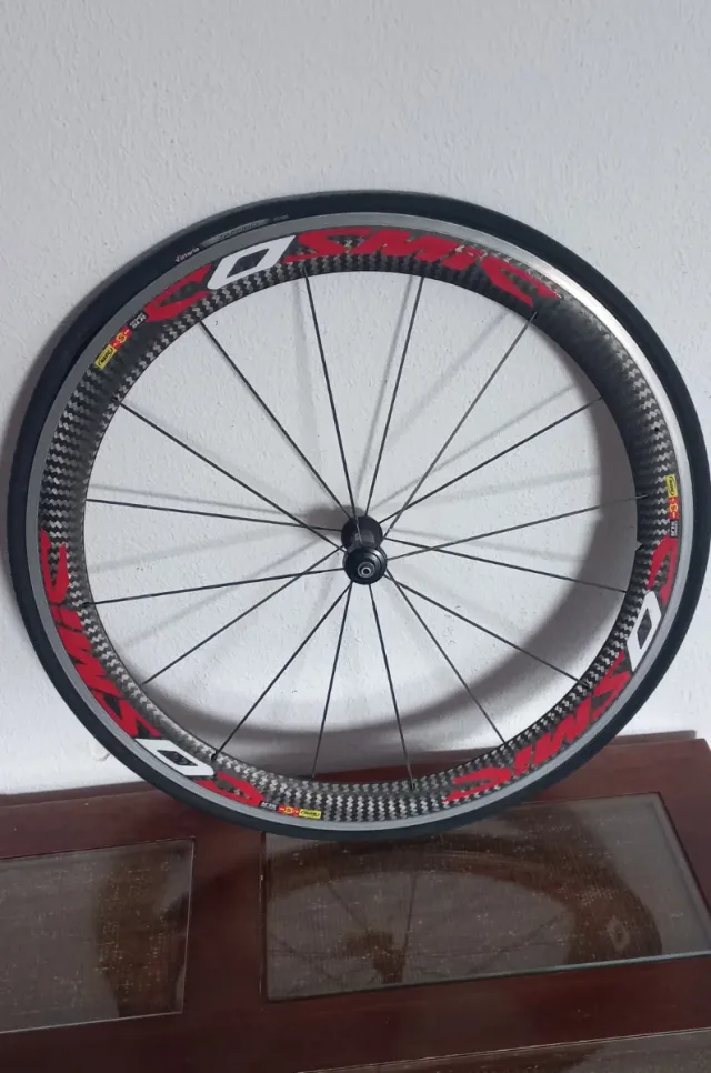 Rueda delantera Mavic Cosmic de carbono. - Llanta de carbono. - Diseño con detalles en rojo y blanco. - Incluye cubierta nueva.