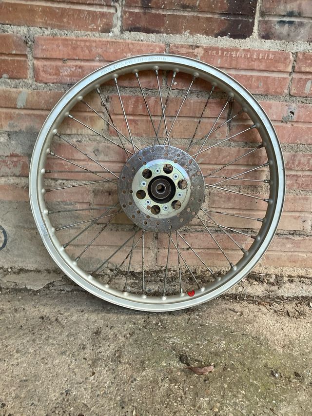 Detalles del productoRueda delantera Original de Montesa Cota 335. Usada, completa y sin roturas. Presenta oxido en el disco de freno y radios. Tiene algún golpe en la llanta, pero gira bastante bien alineada y centrada. - -Llanta aluminio Akront de 21”-1’6. - 36 radios.