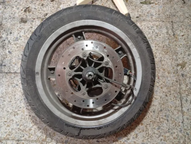Rueda delantera para Piaggio X9 250 EVO. Se vende tal como se ve en las imágenes. - Llanta de aleación. - Disco de freno incluido. - Neumático montado.