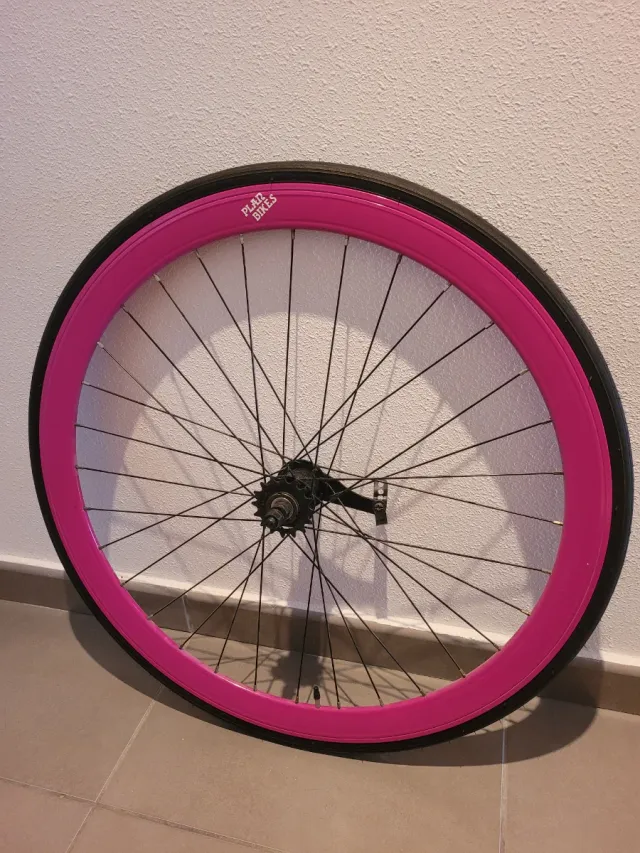 Detalles del productoRueda de bicicleta fixie con freno contrapedal y llanta color personalizado fucsia.