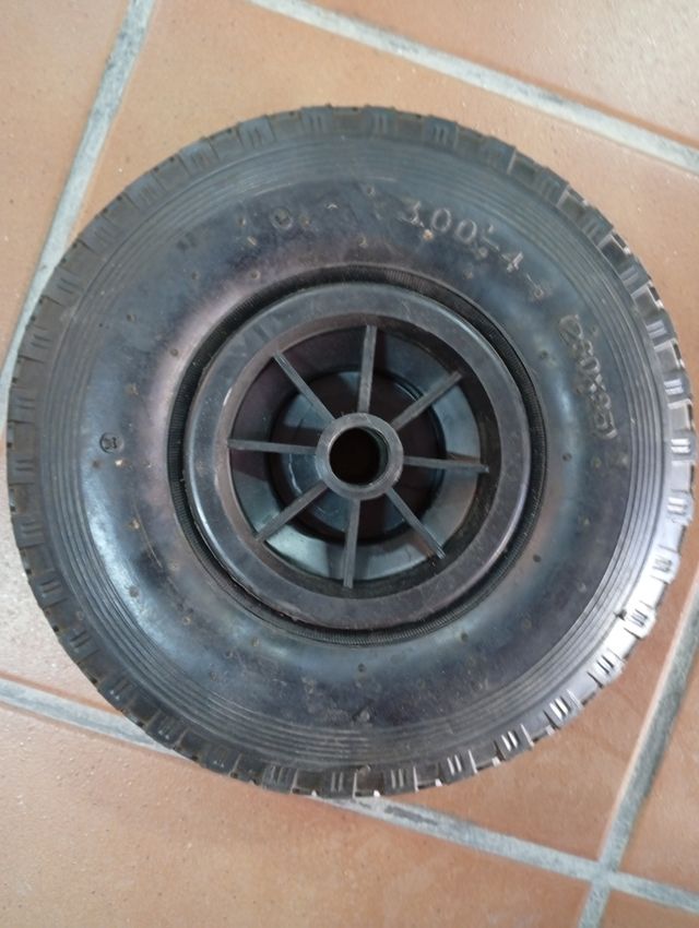 Rueda de repuesto para carretilla o similar, con cámara incluida. - Medida: 3.00-4 (250x85). - Llanta de plástico negro.